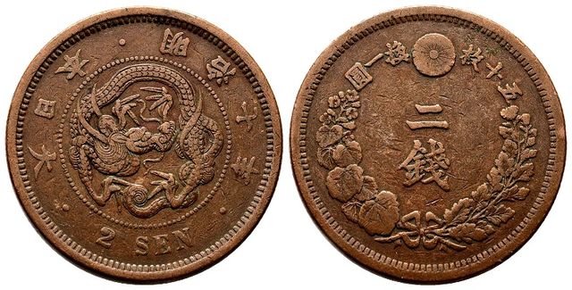 Detalles del producto2 Sen, 1874. Japón. Mutsuhito (Era Meiji). Bronce. Canto suave (年七治明).