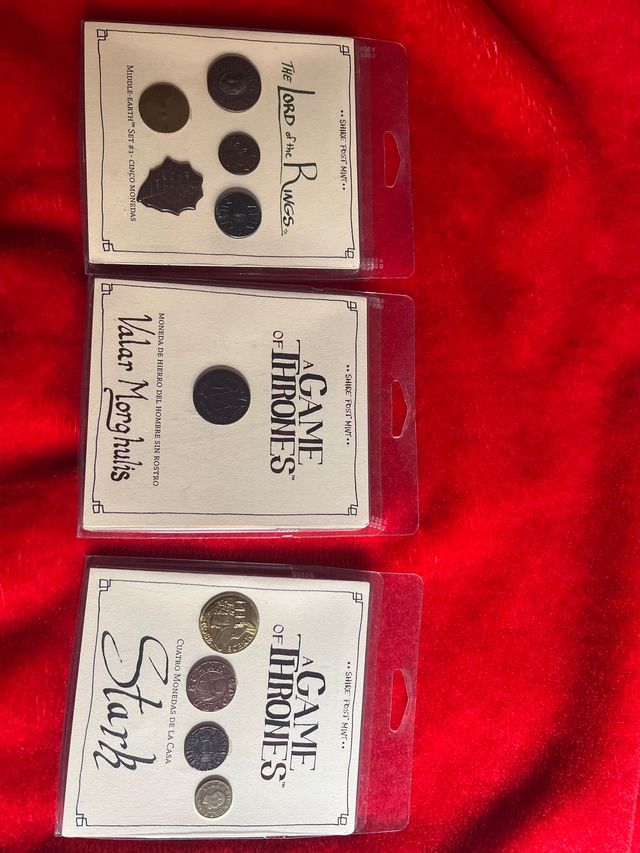 Detalles del productoSe venden tres sets de monedas coleccionables de metal. Cada set incluye varias monedas con diseños de El Señor de los Anillos y Juego de Tronos. Las monedas se encuentran en buen estado, en sus respectivos blíster. - Tres sets de monedas en total. - Monedas de El Señor de los Anillos y Juego de Tronos. - Ideales para coleccionistas. Medidas del producto