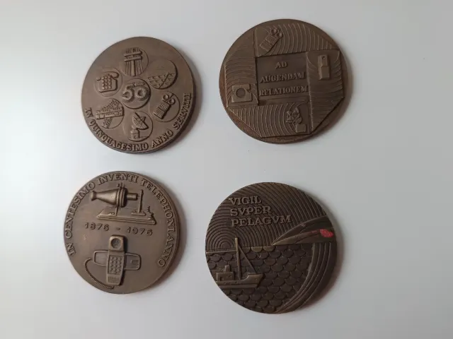 - Moneda 1: IN QUINQUAGESINO ANNO SERVI con 50 en el centro y varios iconos de telecomunicaciones.