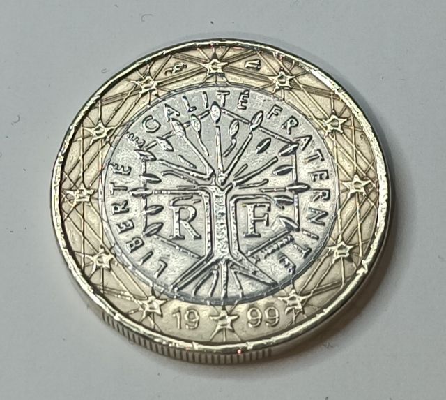 Primera edición de la moneda europea en Francia de 1 Euro. Está compuesta por ciproniquel