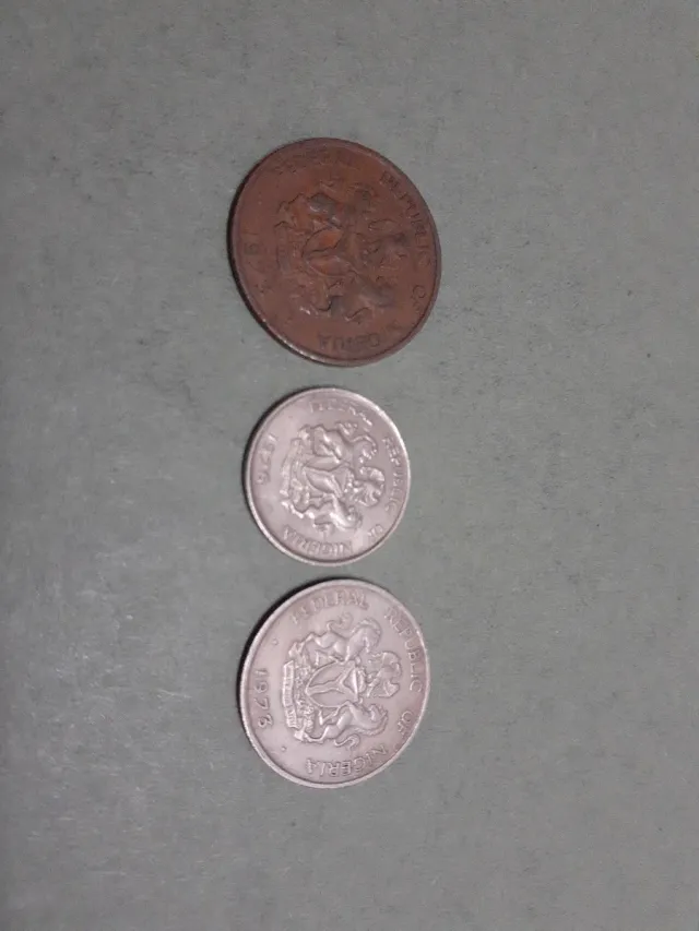 Conjunto de tres monedas de Nigeria. - Una moneda de color cobre con un león. - Dos monedas de color plateado con el escudo de Nigeria.