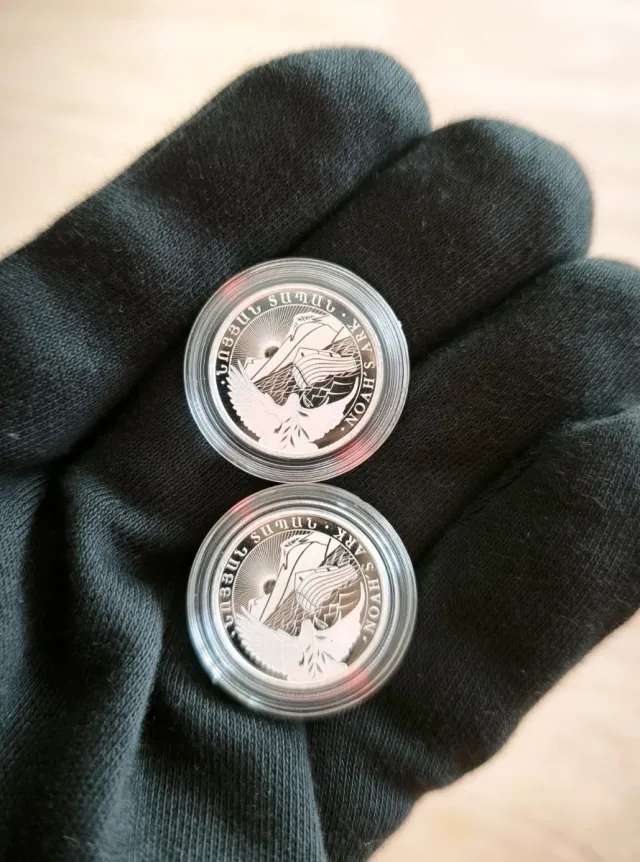 Lote de 2 monedas de plata de alta pureza con diseño del Arca de Noé, con un peso de 1/4 Oz cada moneda.