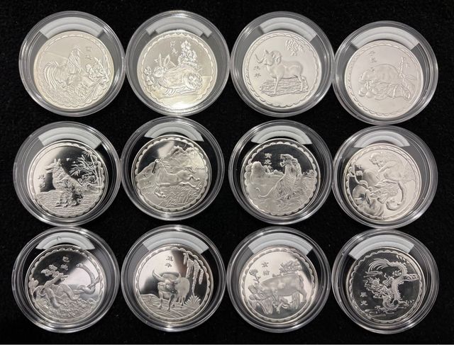 Detalles del productoConjunto de 12 medallas/monedas conmemorativas del horóscopo chino. Cada moneda presenta un diseño detallado de uno de los animales del zodiaco.