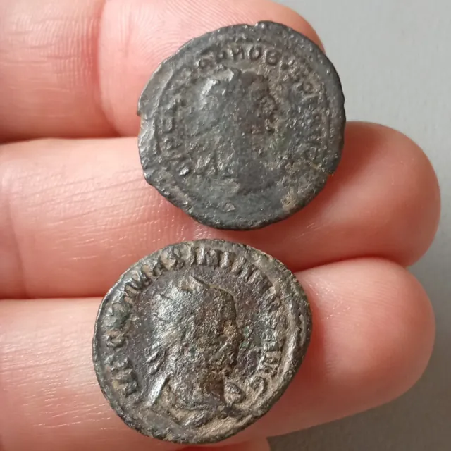 Detalles del productoEspectacular Lote de 2 monedas romanas Antininianos de Probo y Maximinus, originales. Acuñadas a martillo en bronce.