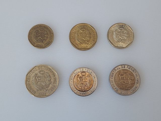 Conjunto de monedas peruanas de 0,10, 0,20, 0,50, 1, 2 y 5 soles.
