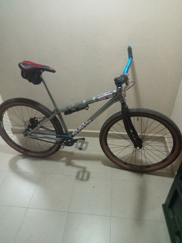 Bicicleta Mongoose para dirt jump y BMX - Cuadro de cromoly - Ruedas de 26 pulgadas. - Manillar azul. - Sillín rojo y negro.