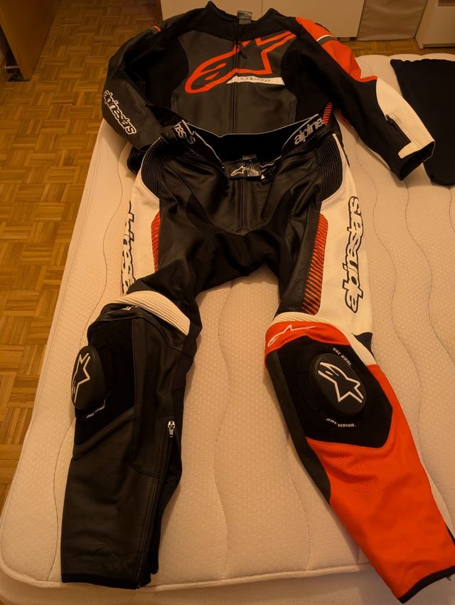 Mono de dos piezas de la marca AlpineStars. - Talla Europea 56. - Diseño en negro, blanco y naranja. - Logos de la marca visibles.