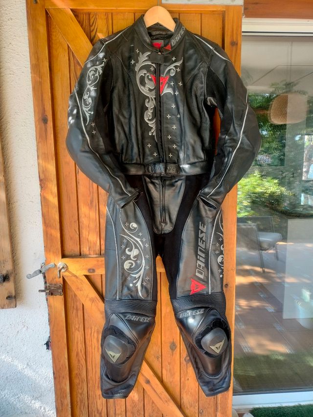Detalles del productoMono de cuero Dainese para mujer, detalles plateados y logo rojo.