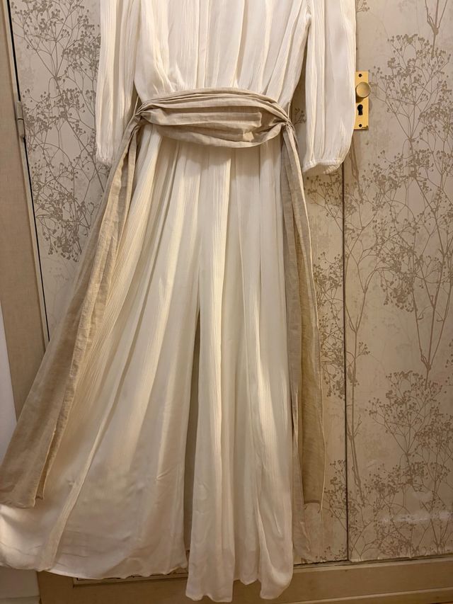 Elegante mono blanco para niña, ideal para celebraciones. 152 cm - Tejido ligero y vaporoso. - Cinturón de tela a juego. - Mangas largas abullonadas.