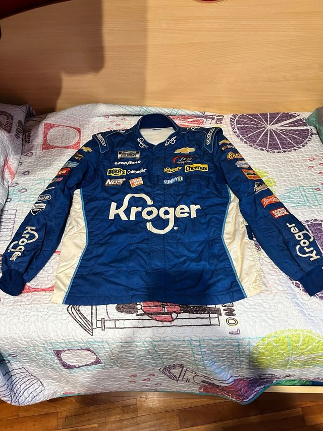 Detalles del productoMono de carreras azul con logo de Kroger de supermercado americano y patrocinadores todo bordado hecho en Italia. Para el equipo JTD Daugherty Racing 47 de Ricky Stenhouse Jr. Solo la parte de arriba. Tiene algunos desperfectos del uso en carreras, como algún agujerito y alguna mancha de aceite en el abdomen. ESCUCHO OFERTAS SERIAS. Nombre del pit crew: Anderson