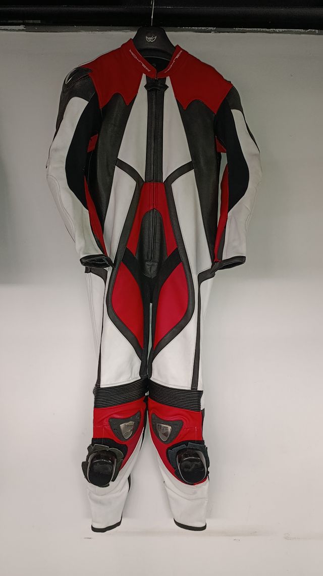Mono de cuero Royner blanco y rojo, completamente nuevo.