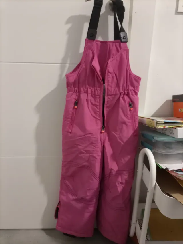 Mono de esquí de color rosa, perfecto para las aventuras en la nieve. - Tirantes ajustables. - Cremallera frontal. - Bolsillos con cremallera.