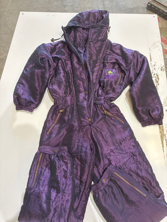 Mono de esquí vintage en un llamativo color morado iridiscente. Perfecto para un estilo retro en la montaña.