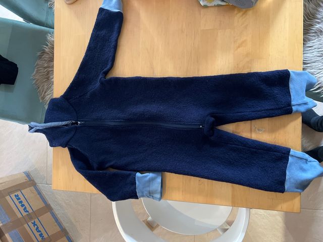 Mono de lana para bebé, perfecto para mantener el calor. - Color azul marino. - Puños y cuello en azul claro. - Cierre de cremallera frontal.