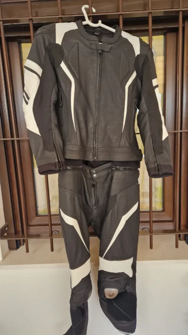 Detalles del productoMono de moto de dos piezas para mujer, diseñado para ofrecer protección y comodidad en la carretera. Combina cuero negro con detalles blancos.