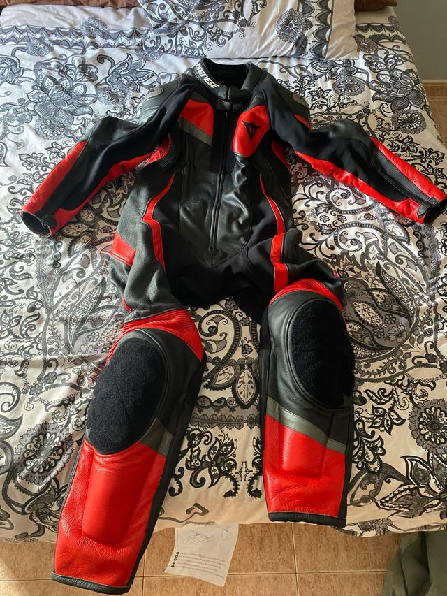 Detalles del productoMono de moto de cuero Dainese en color negro y rojo. Diseñado para ofrecer protección y comodidad en la conducción.
