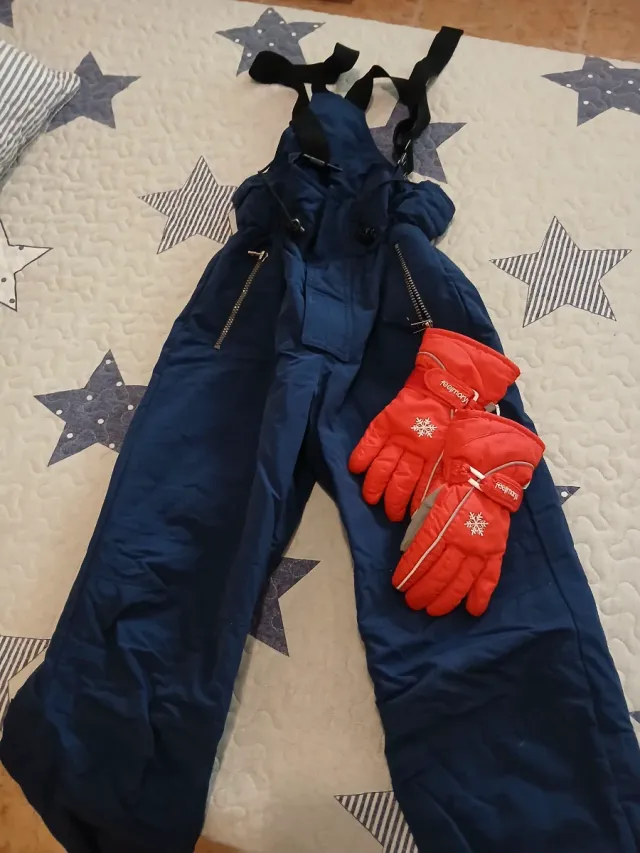 Conjunto de ropa de invierno para la nieve, ideal para mantener el calor y la sequedad. - Mono de nieve azul. - Guantes rojos.