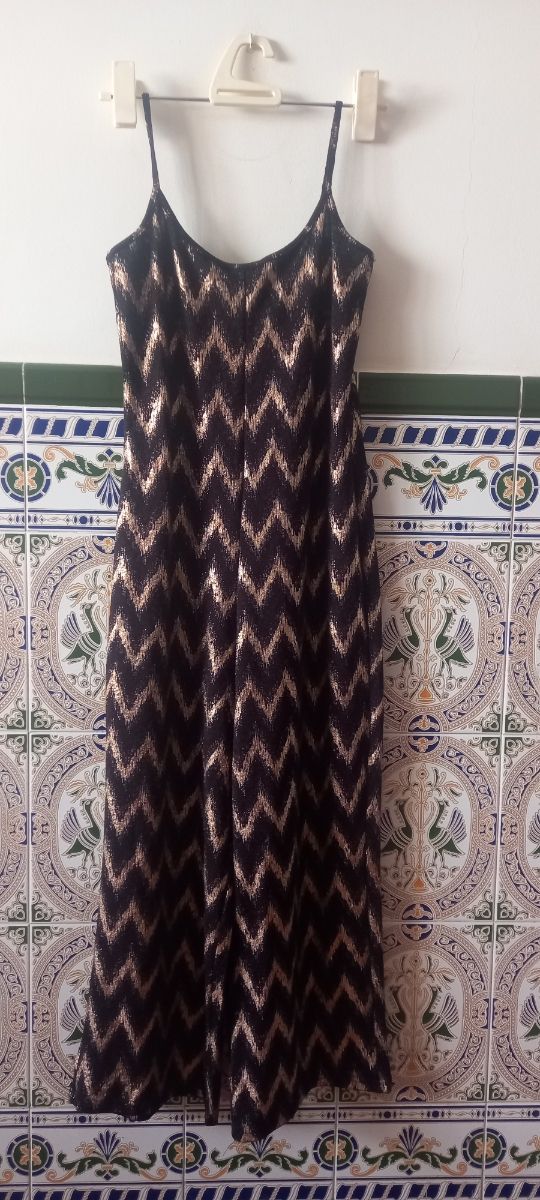 Mono enterizo de tirantes patas de elefante con franjas horizontales color dorado.