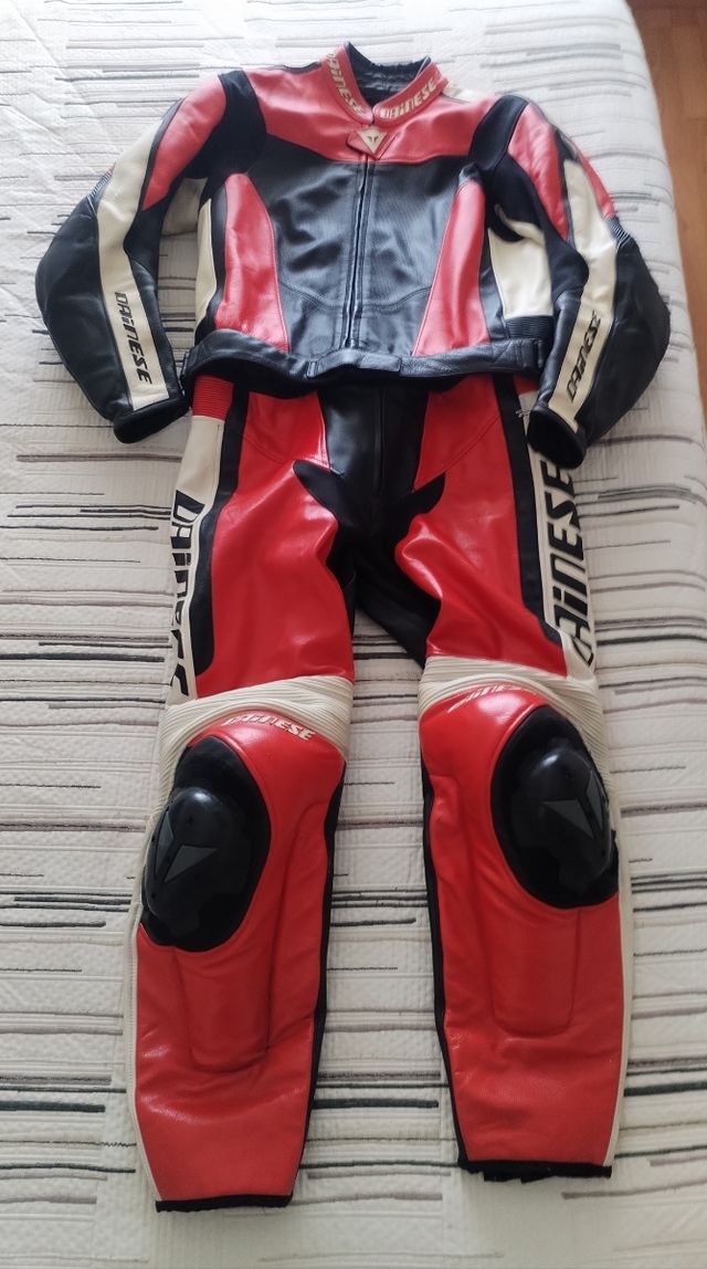 Detalles del productoMono de cuero para moto Dainese talla 56 (equivalente a una XL) en rojo, negro y blanco. Diseñado para ofrecer protección y estilo en la carretera. Esta en buen estado, sin roturas ni roces.