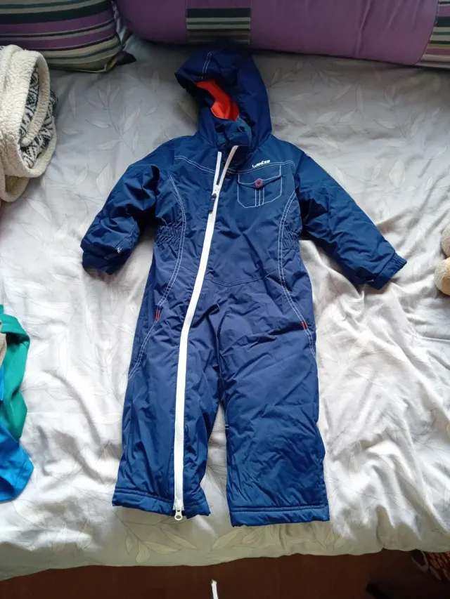 Detalles del productoMono de nieve azul, ideal para esquiar o jugar en la nieve. Cuenta con capucha y cremallera frontal.