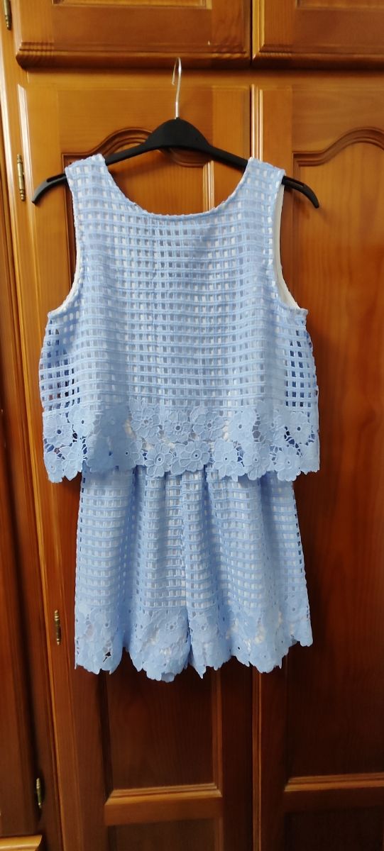 Detalles del productoMono de niña azul celeste, talla 18 años-167cm.,marca Mayoral, tejido de encaje. Reforzar costura del cuerpo derecho ya que viene así de fábrica. Cremallera parte posterior.Muy bien cuidado.