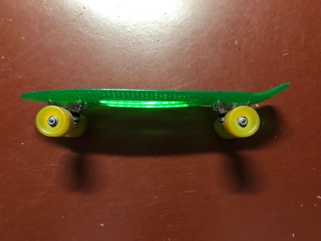 Monopatin de color verde. En buen estado. Medidas largo 57 cm ancho 14 cm y alto 9 cm