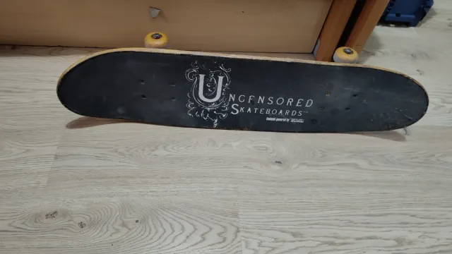 Monopatín de la marca UNCENSORED SKATEBOARDS. - Diseño con logo blanco. - Ruedas amarillas.