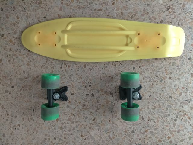 Monopatín amarillo un poco desgastado. - Incluye tabla y 2 juegos de ruedas (con los tornillos para montarlo) - Color amarillo pastel.