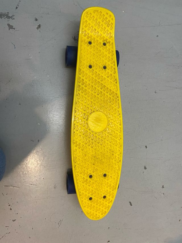 Monopatín de color amarillo brillante con ruedas azules. - Superficie con relieve antideslizante. - Ruedas de color azul oscuro.