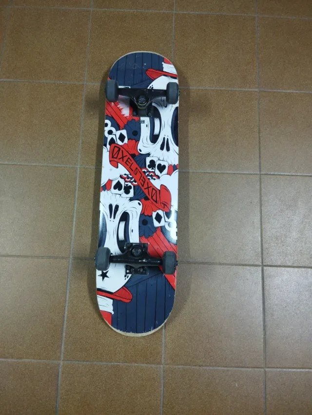 Monopatín con un diseño llamativo de calaveras y naipes. - Diseño principal en blanco con detalles en rojo y azul marino. - Ruedas negras. - Ejes metálicos negros.