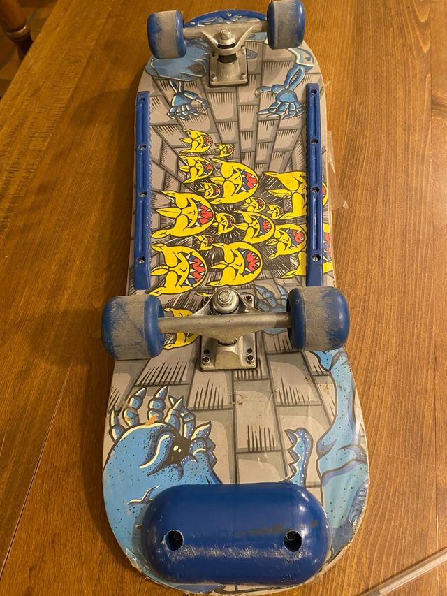 Monopatín con un diseño llamativo y colorido. - Ruedas azules. - Gráficos de criaturas y ladrillos grises. - Base con protector azul.
