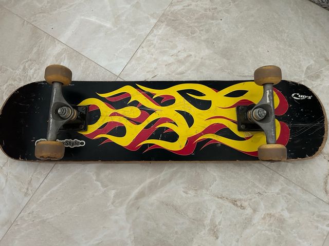 Detalles del productoMonopatín con un llamativo diseño de llamas en colores amarillo y rojo sobre fondo negro. Ideal para deslizarse y practicar trucos.
