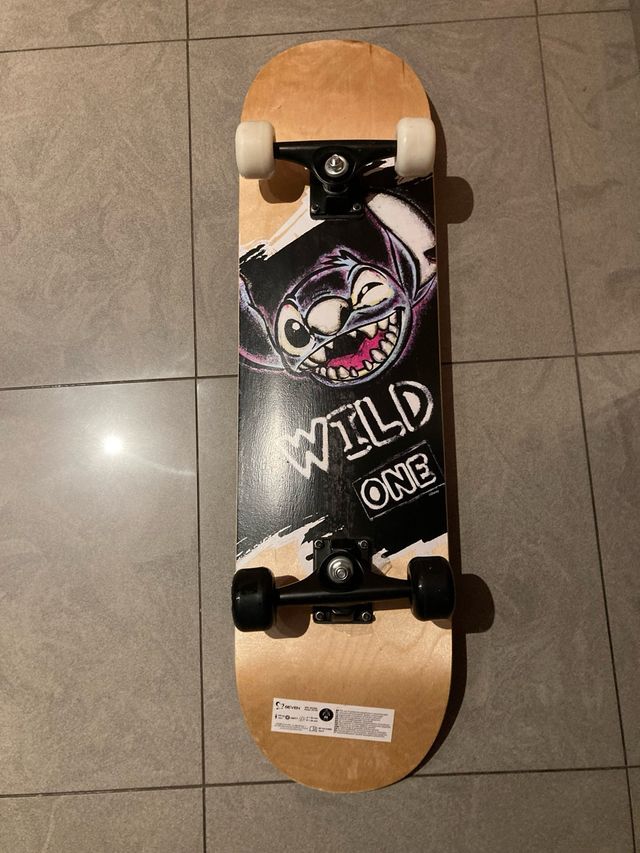 Monopatín con un divertido diseño inspirado en Stitch. - Tabla de madera con gráfico. - Ruedas blancas y negras.