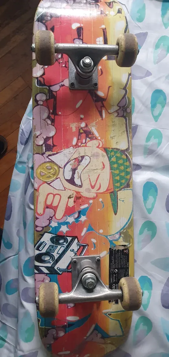 Detalles del productoMonopatín con un diseño llamativo y colorido estilo graffiti.