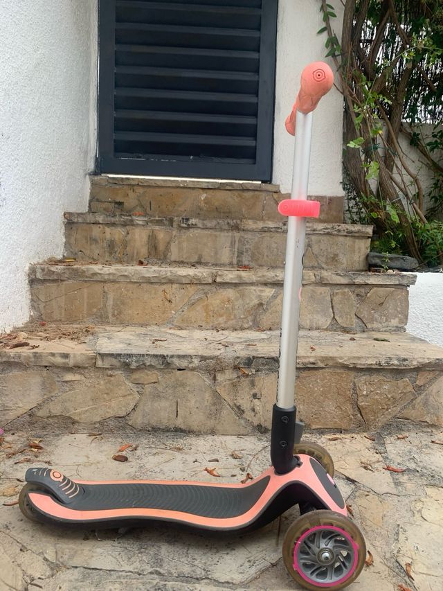 Monopatín infantil de tres ruedas, ideal para los más pequeños. - Color rosa y negro. - Plataforma antideslizante. - Ruedas de goma luminosas.