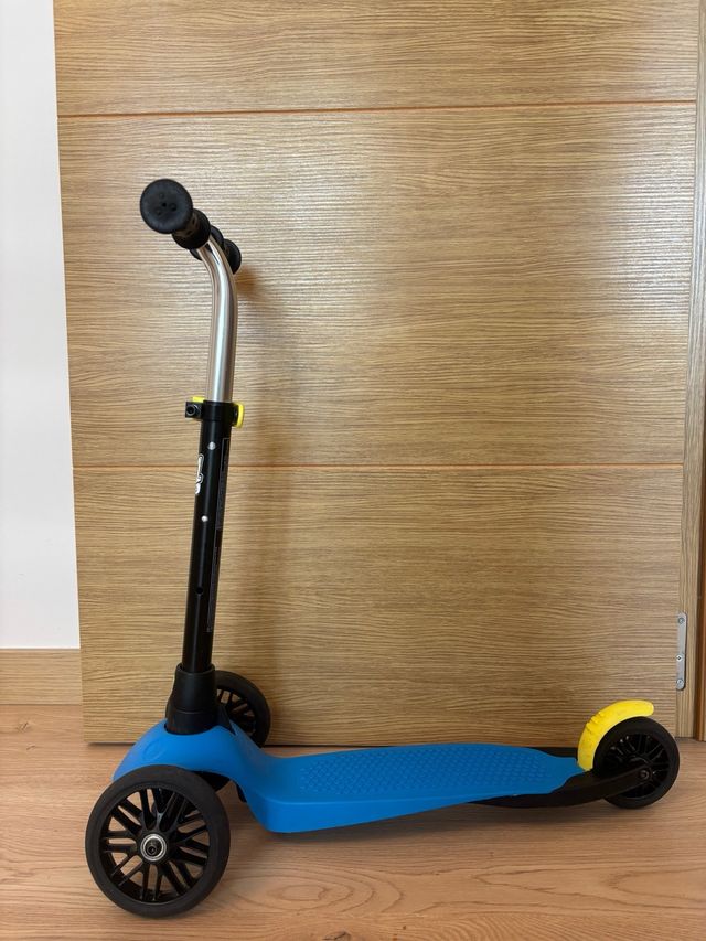 Monopatín de tres ruedas en color azul, diseñado para niños. - Plataforma antideslizante. - Ruedas resistentes. - Manillar ajustable en altura.