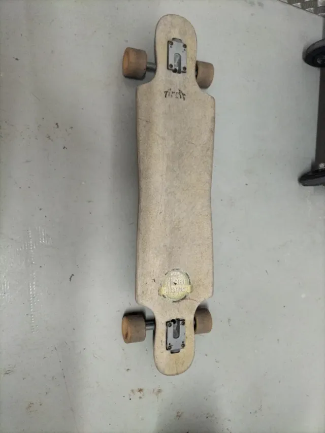 Monopatín tipo longboard con un diseño alargado y ruedas anchas. - Tabla de madera. - Ruedas de color marrón. - Ejes metálicos.