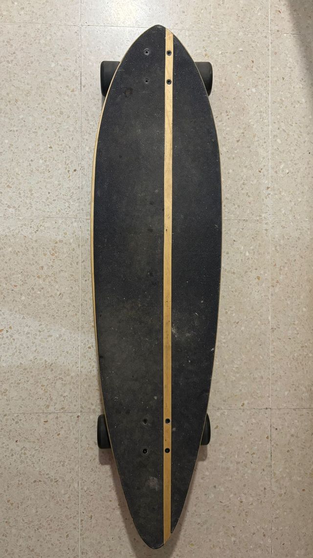 Monopatín longboard Oxelo en excelente estado, con muy poco uso. - Diseño con franja central. - Ruedas negras.