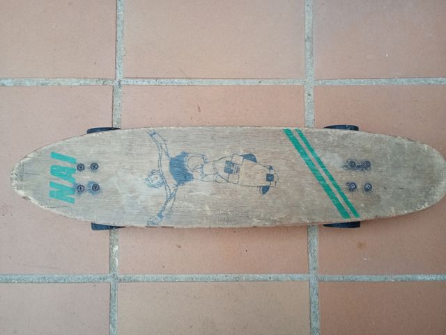 Monopatín de madera con diseño gráfico. - Diseño gráfico de figura humana. - Detalle de líneas verdes.