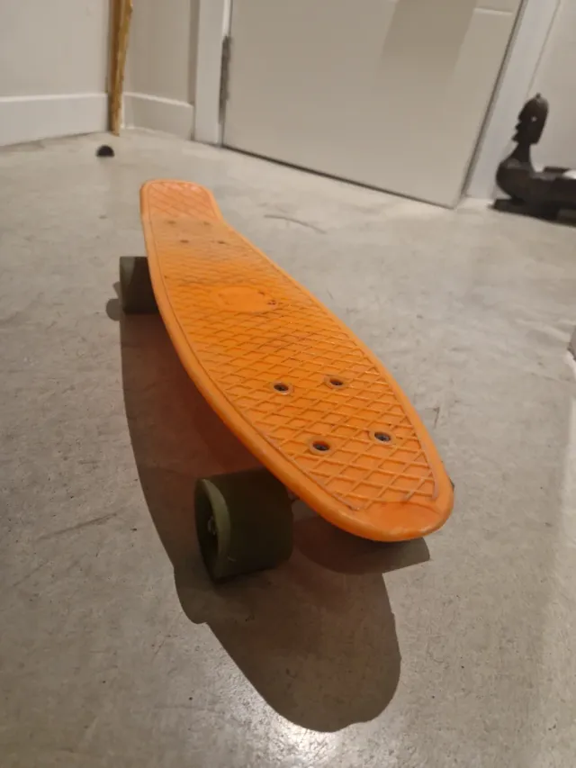 Monopatín de plástico naranja. - Ruedas verdes.