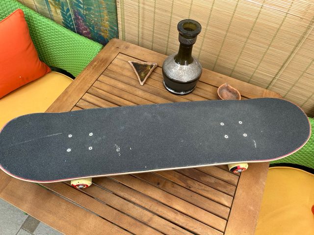 Monopatín con lija negra y ruedas amarillas. - Tabla con lija. - Ruedas de color amarillo.