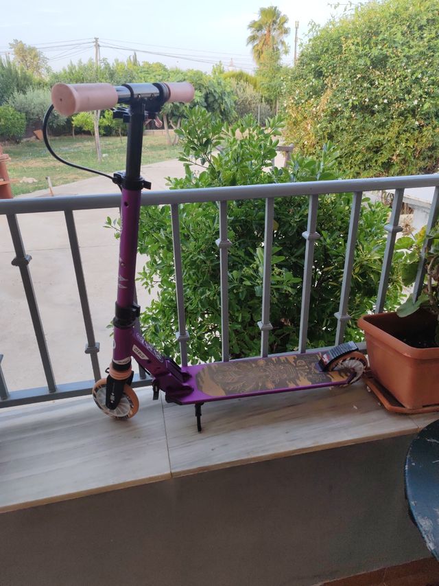 Patinete infantil en perfecto estado. Ideal para niñas. - Color morado con detalles en beige. - Diseño juvenil y atractivo. - Manillar cómodo y fácil de agarrar.