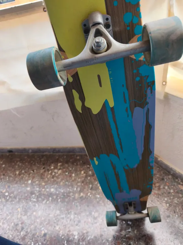 - Tabla con diseño de salpicaduras en amarillo, azul y morado.