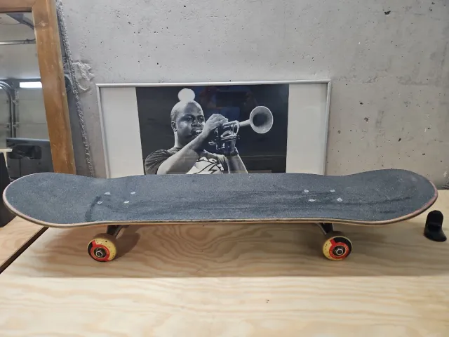 Monopatín de la marca Oxelo, ideal para iniciarse en el skate. - Tabla con lija. - Ruedas amarillas y rojas.