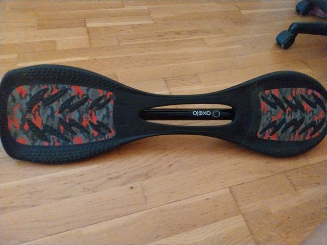 Monopatín Oxelo de segunda mano, en buen estado. - Diseño resistente. - Color negro con estampado de camuflaje. - Ruedas de color naranja.