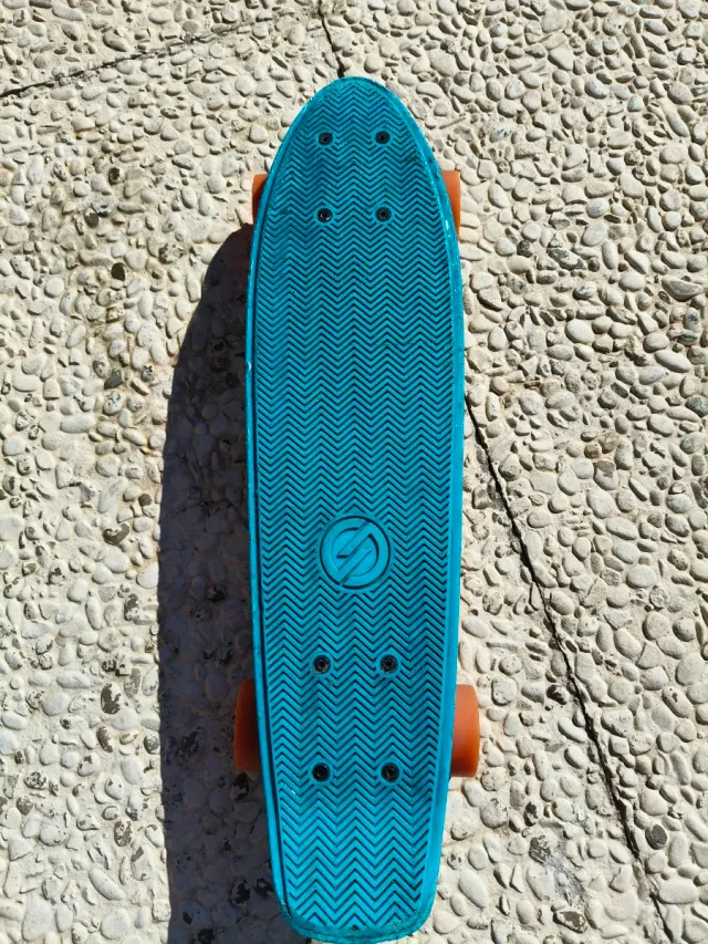 Monopatín de la marca Oxelo en color azul. Tiene marcas y roces típicos del uso. - Diseño con textura antideslizante. - Ruedas de color naranja. - Logo de la marca en el centro.