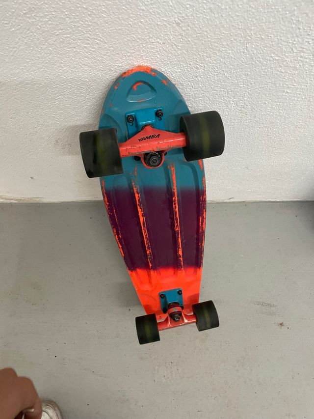 Detalles del productoMonopatín Oxelo Big Yamba 120 con un diseño degradado en tonos turquesa, morado y naranja.