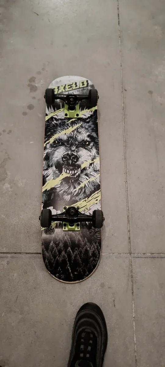 Monopatín Oxelo con un diseño llamativo de lobo y bosque. Está prácticamente sin usar. Como nuevo