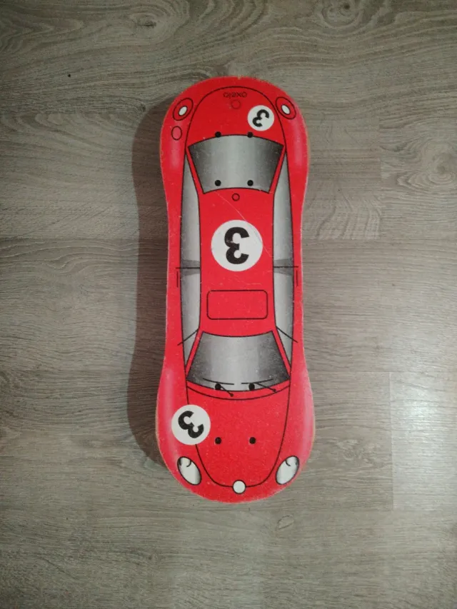 Detalles del productoMonopatín Oxelo de color rojo, diseñado para niños. Presenta un divertido diseño de coche de carreras con el número 3.
