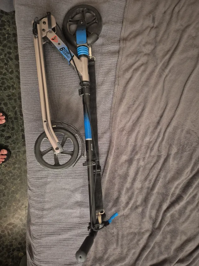 Monopatín plegable de la marca Oxelo, modelo MID 9. Ideal para niños. - Color gris y azul. - Ruedas de 200 mm. - Freno en rueda trasera. - Altura ajustable.